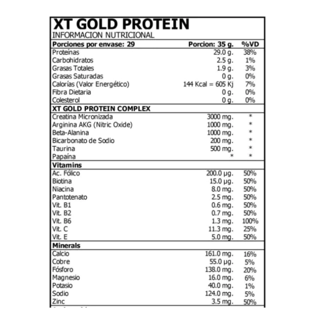 El XT Gold Protein de HTN es un suplemento proteico de última generación, formulado con proteínas de alta pureza y un perfil completo de aminoácidos esenciales. Ideal para deportistas exigentes, ayuda a optimizar cada repetición y acelerar tu progreso en el gimnasio.